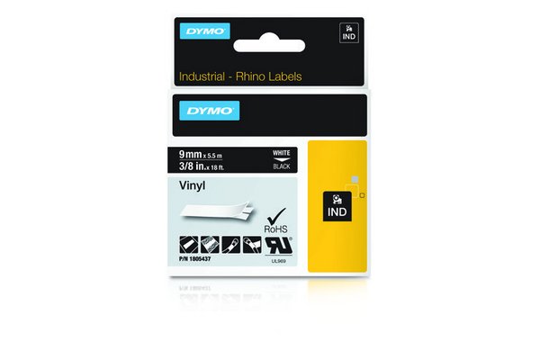 DYMO Etiquette Rhino vinyle blanc sur noir 9 x 5,5 mm